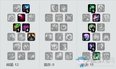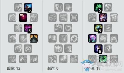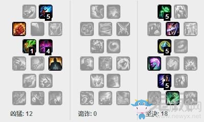 12-0-18的组合,波比线上能力还可以,点凶猛系受益是大于诡诈系的,第二格点出新鲜血液提高被动的消耗伤害,战斗专注也是坦克英雄战斗必点的,坚决系巨像为核心,符能盔甲也是必点的。