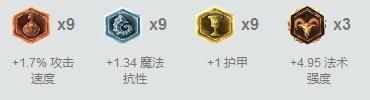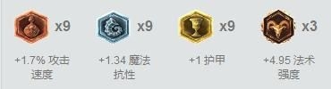 大树和泰坦类似由于被动的原因也是比较吃普攻的,所以红色选择攻击速度,自身技能是AP加成,精华可以选择法术强度,黄色和蓝色带常规的护甲魔抗。