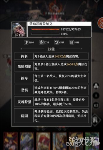 在这一关,玩家遇到的是一个等级为118级的boss,这个角色在对战的时候,也会使用技能进行攻击,首先可以使用挥展,对对手带来14292点的魔法伤害,另外还可以用黑暗烈焰队场上的三名成员带来大量的魔法伤害,玩家需要在保证输出的前提下,选择两名坦克类型的角色,这样才能抵抗对手更多的伤害,角色还可以用掠夺技能在游戏里进行对战,除了能让玩家阵营的成员受到伤害之外,这个boss还会恢复自身的生命值,为了避免对方的血量恢复过多,玩家需要尽可能选择一些强力的输出角色,这样才可以。快速结束战斗。