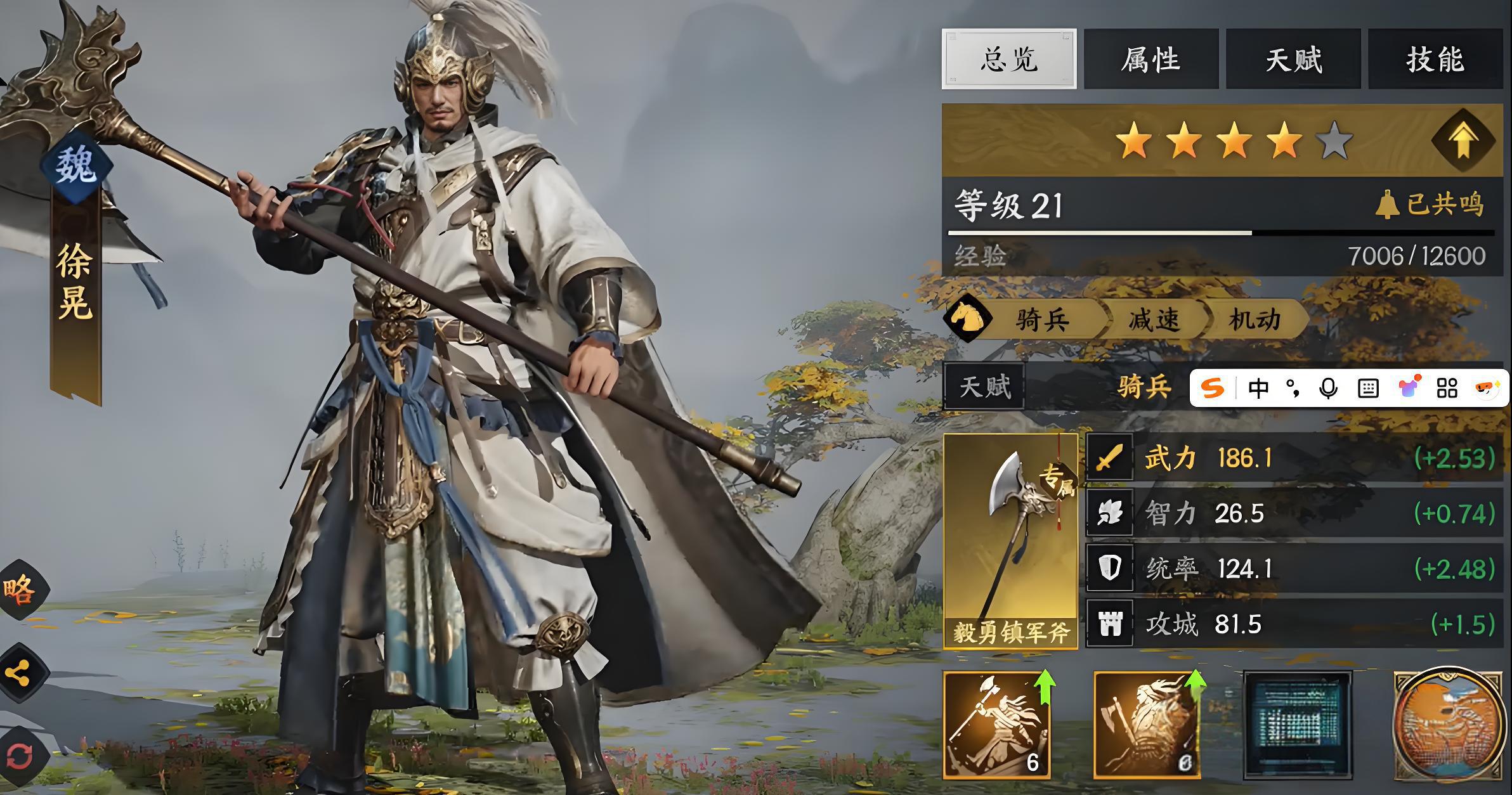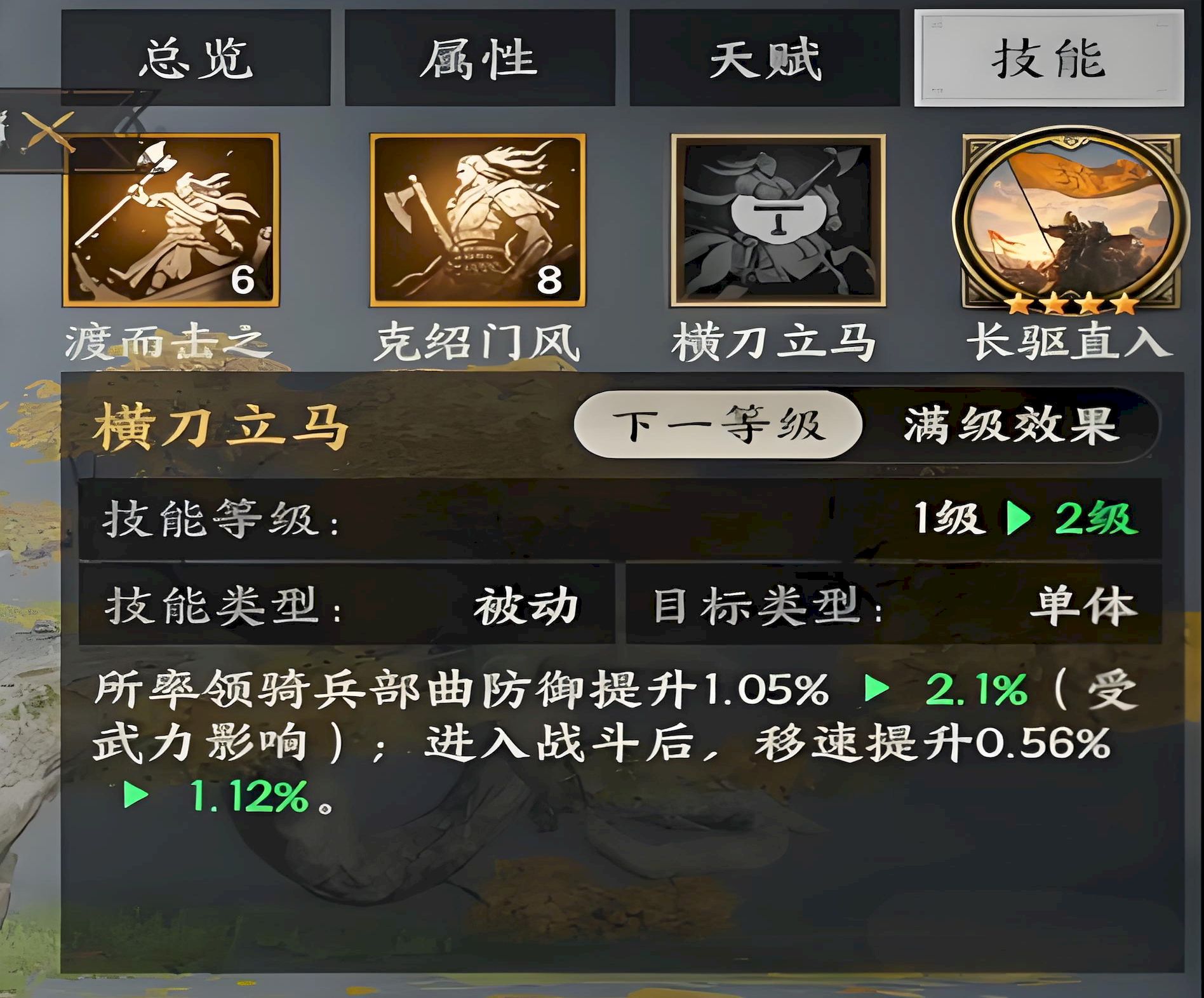 2、被动技能克绍门风与横刀立马为成长提供支撑,前者击败敌人后加骑兵移速,后者强化生存,新手可优先升级后者。