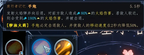 手炮的优势在于配合“秽浊火药”,能打断绝大多数敌人的行动,在前期有着不错的拉扯和生存能力。