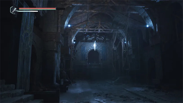 沿着走廊前进,直到到达一座小教堂,祭坛上方有一块巨大的发光水晶。