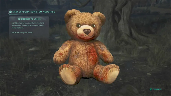 当你到达时,有一棵树,树枝上挂着多具尸体。在孩子的身体下面是一个发光的互动对象,你会发现一个血腥毛绒玩具。
