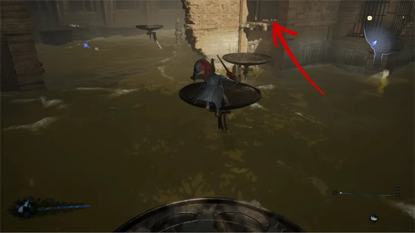 继续跳上平台绕过建筑物,然后降落在另一个门关闭的平台上。按左侧的水平仪将其打开。