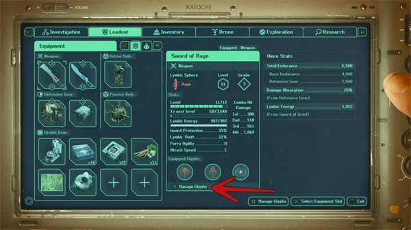 铭文进入物品栏之后,可以将它们装备到你的武器上。转到“装备”选项卡并将鼠标悬停在两个武器槽之一上。您会在统计信息部分的底部看到“添加”或“管理”选项可用。