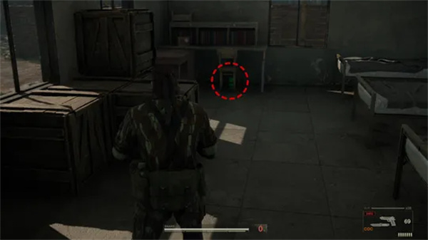 前往关押索科洛夫的房间,但暂时不要进去。在左侧,您可以在一些板条箱的顶部找到纸板箱 A。您还可以在右下角索科洛夫房间之前的房间中找到探雷器。然后,进入房间,您可以在左侧的储物柜中找到热护目镜。