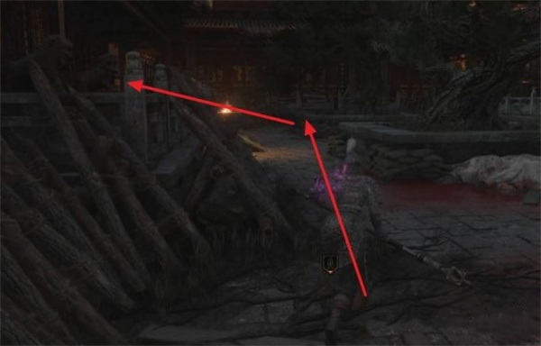 返回屋顶穿过木桥,经墙壁缺口直走至对面建筑楼梯处左拐。