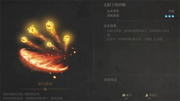 向前方挥出一道羽化属性的剑气,同时放出五枚法球。在法术一开始释放时被击中,可触发【飞羽】。