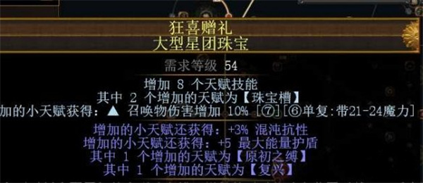 星团:8天赋68级以上的召唤星团洗出原初+腐烂之爪、原初+复兴、原初+寸草不生的两天赋技能组合,可以庄园生命C、改造石制作,别的组合位置不对。