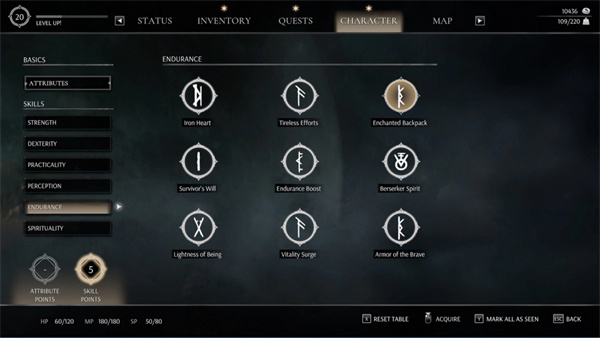 耐力属性:每点提升你的生命值(+10),耐力(+5)和承载能力(+5)。