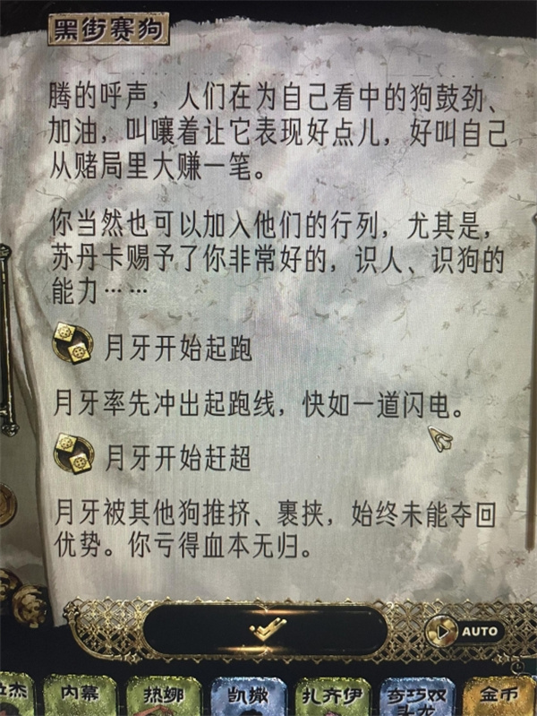 1、首先赌狗的前置剧情是需要参加赌马,有几次赌马之后会出现赌狗支线,与赌马最大的区别就是不能放卡去重新投掷,而且要判定三次都成功,选的月牙,要六个骰子投三,判定三次。
