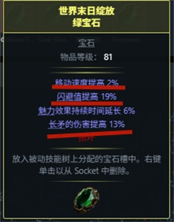 选择翠绿珠宝,词条方面可以选择移速、长锋伤害提升、攻击伤害提升、投射物速度、闪避值提高等词条。
