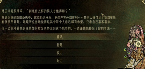 2、接着在第二次和阿鲁米娜会面时,选择【勇武】,可以得知她喜欢跑得快的男人。