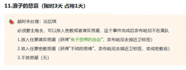 4、放入谋反思潮后,可以获得【免于恐惧的自由】,并且奈布哈尼会去掉近卫标签;放入密教思潮后,会获得【不结的情绪】,奈布哈尼会去掉近卫标签,变成密教徒。