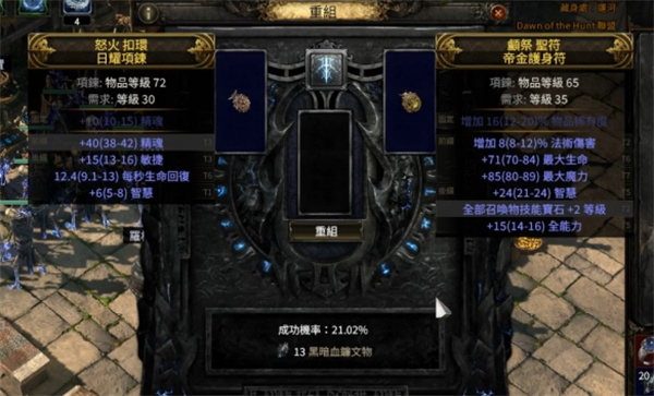 点击重组就有概率获得精魄和+3技能的项链,当然如果失败了这个装备就没了。
