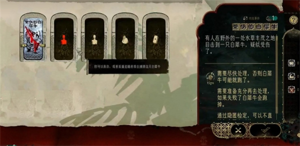 1、首先要触发【受伤的白犀牛】,该事件会在第15-23天随机触发;