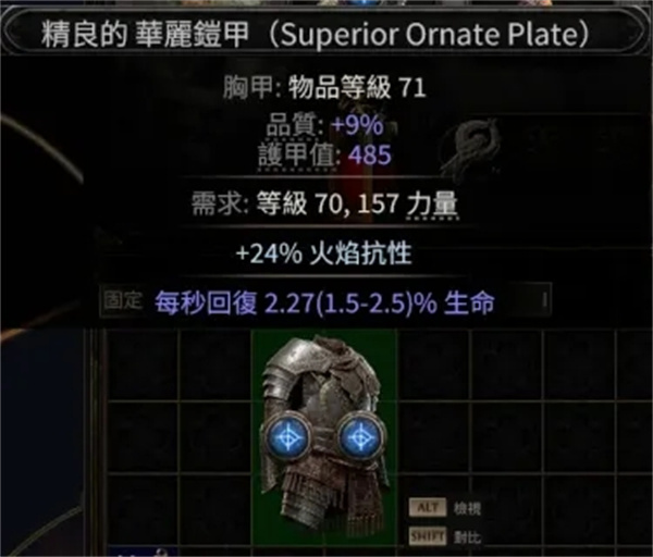 盾牌词缀:格挡率=力量>生命>护甲>最大火焰抗性>额外物理伤害减免>最大混沌抗性