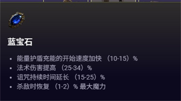选择蓝宝石,词条可以选择能量护盾充能速度加快、法术伤害、诅咒持续时间、击杀回复魔力。