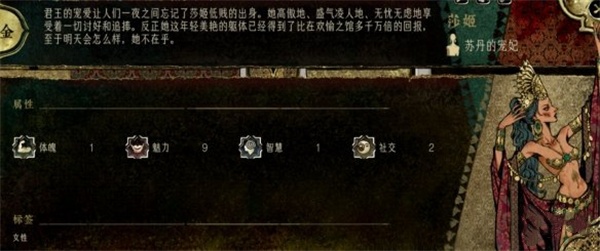 在卡牌策略角色扮演游戏苏丹的游戏中,每个NPC都有对应的人物事件,具有时限、耗时、判定属性、消卡等区别,部分玩家不知道苏丹的宠妃莎姬有什么事件,下面就为大家带来苏丹的游戏中莎姬人物事件的介绍说明,有需要的玩家可以参考。