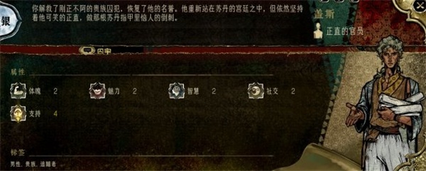 需要一张不高于白银的征服卡,进行社交和智慧综合检定,不少于五点成功,善名+1 权势+1 两天后触发收服正直的官员 盖斯变为随从 事件结束