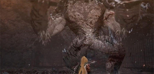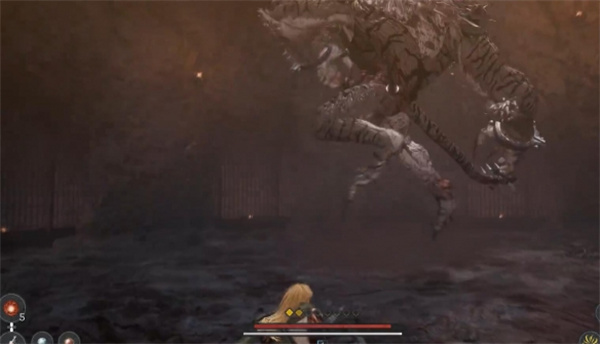 4、半血左右起跳向前大范围攻击,躲开后boss会摔倒,boss起身后在周围跳四次;