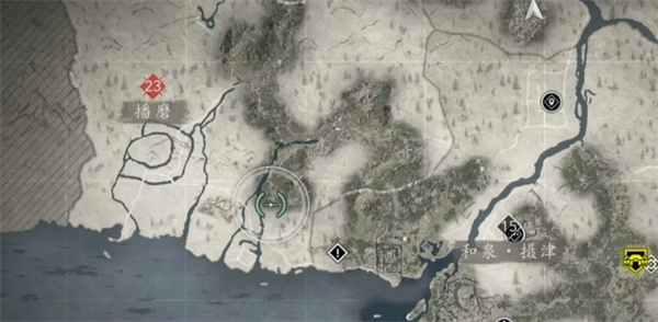 在播磨最南边加古川河口上方偏右一点的高木大冢岩。旁边有高木古坟,里面有弥助武器,记得搜一搜。一号标点位置。