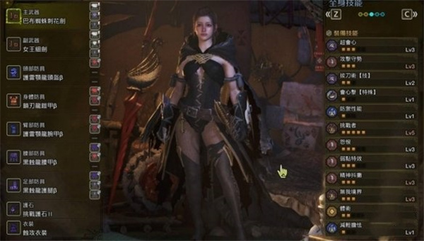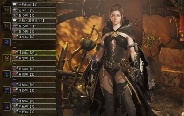 选择两件护雷颚龙能够触发额外耐力,方便获得精神抖擞,并且JR后跳在体术2的情况下,跳完额外耐力的精准防御,也找不会耗光额外的耐力条,我们在搭配两件黑蚀套加上无我,选择配到挑战5后就能获得高基础伤害,以及15%的会心,接着再用怨恨来叠加基础伤害。
