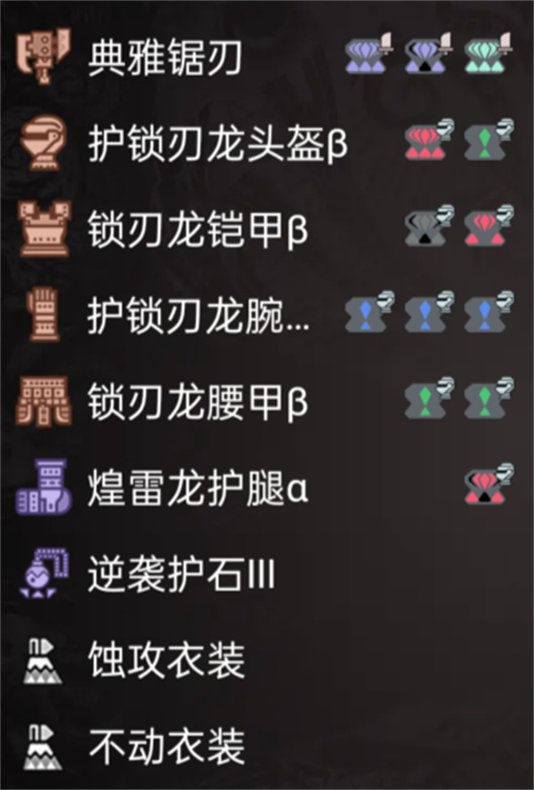 解析:身体、臂部和腰部提供了5级的弱特,鞋和胸提供了3层的精神抖擞,搭配机械武器可以提供满会,并且可以保证压解,武器属性瓶有补正,币灭龙瓶好,适应后无需集中速变强化持续。