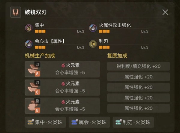 2、珠子:集中·火炎3、属会·火炎3、利刃·火炎3