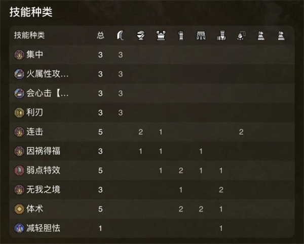 集中3、火属性攻击3、会心击【火属性】3、利刃3、连击5、因祸得福3、弱特5、无我之境3、体术5、减轻胆怯1