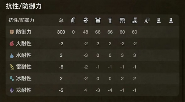 防御300、火耐-2、水耐3、雷耐-6、冰耐2、龙耐-5