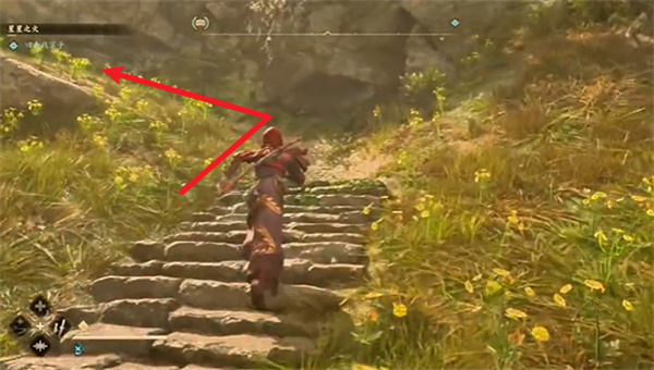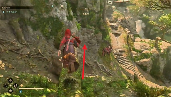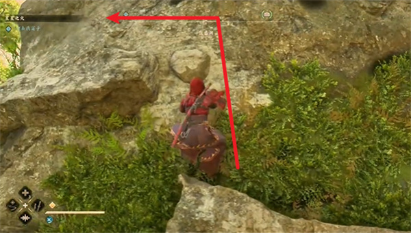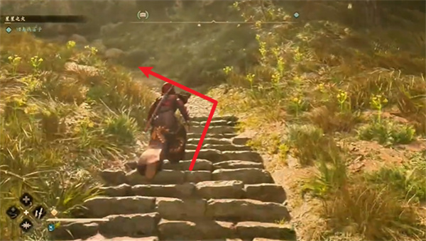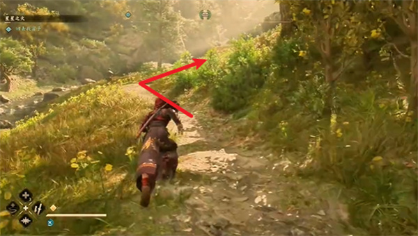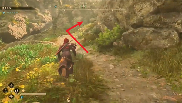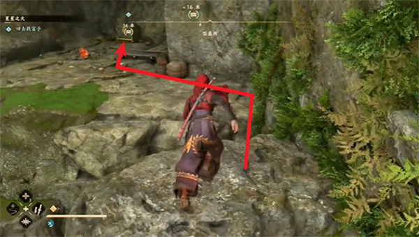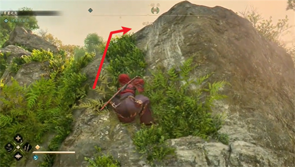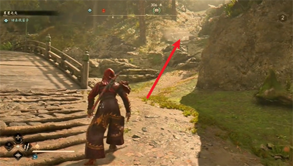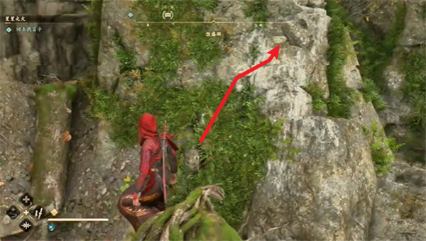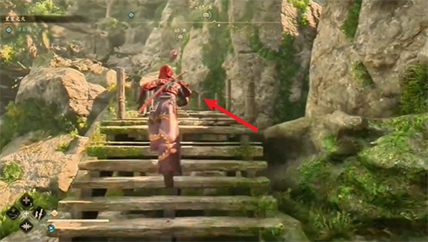 过木桥后爬上右边岩石,装有轻甲的宝箱就在对面平台一个山洞中。