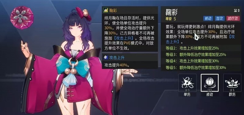 二技能鞠彩是一个全场范围的增益技能,能够提升我方全体角色的攻击力,属于团队型辅助效果。但该技能附带负面状态:在技能持续期间,所有队友受到的治疗效果降低,并且无法获得任何新的增益buff。这意味着在开启鞠彩前需要权衡利弊,避免在即将释放增益或需要高强度回复的阶段使用。尽管存在限制,但在爆发窗口期开启此技能,可显著提高队伍的整体输出效率,尤其适用于短时间内终结战斗的场合,在伊瑟的高阶对战中常被用于关键回合的节奏抢夺。