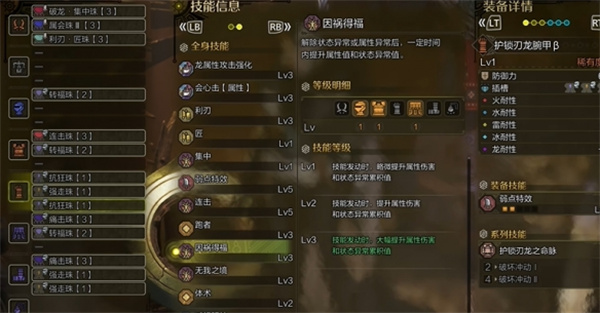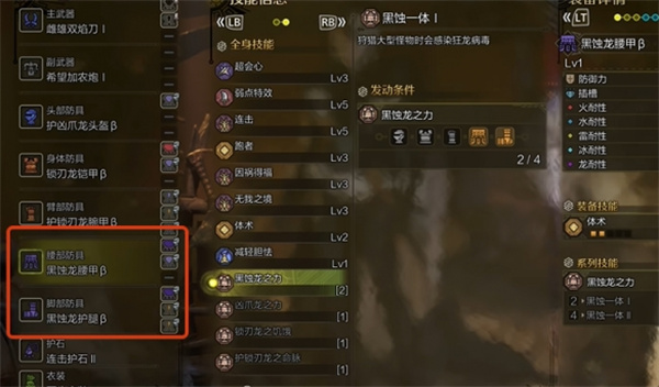 黑蚀龙两件套(任意部位)会触发狂龙症机制。克服狂龙症后,猎人获得15点会心加成,配合“狂龙耐性3”技能可额外增加10点会心。