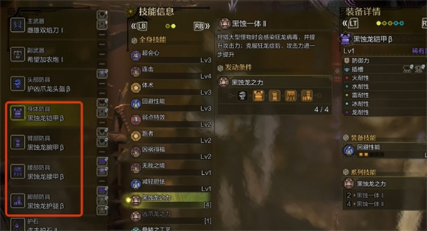 黑蚀龙四件套则提供更高的会心率和攻击力加成,感染时获得5攻击力,克服时再获得10攻击力,但需要玩家更频繁地克服狂龙症。
