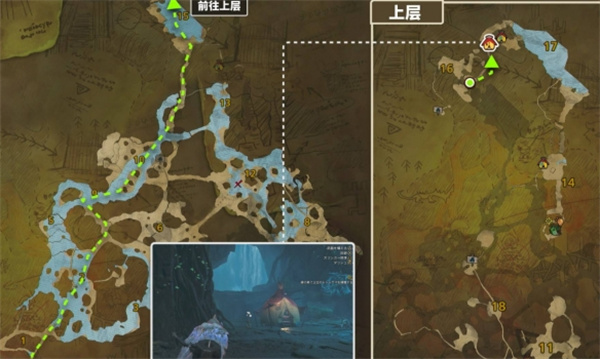 3、区域16可以通过下图所示路线前往。区域16位于区域15悬崖底部的洞窟深处,不需要到达悬崖上方。