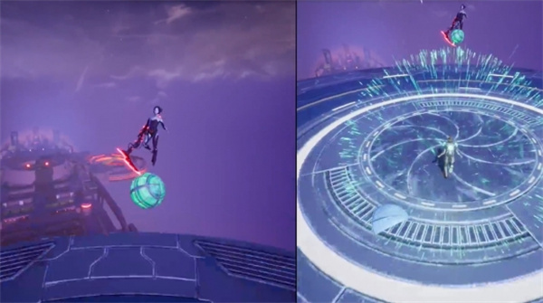 此时其中一人先利用装置弹到对面平台上,再去铺开对面卷起来的桥,另一人便可走桥过来。