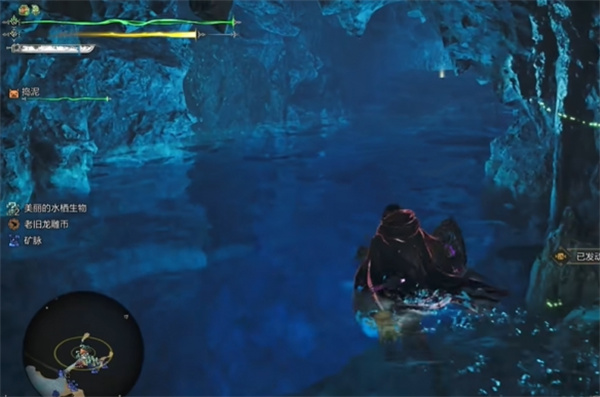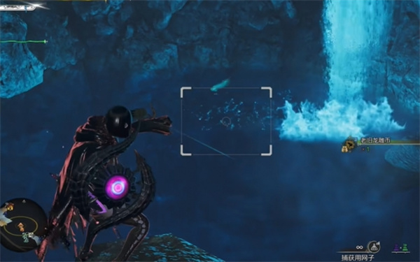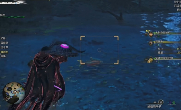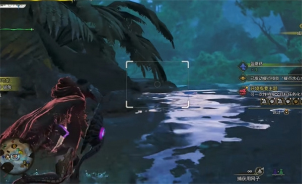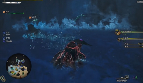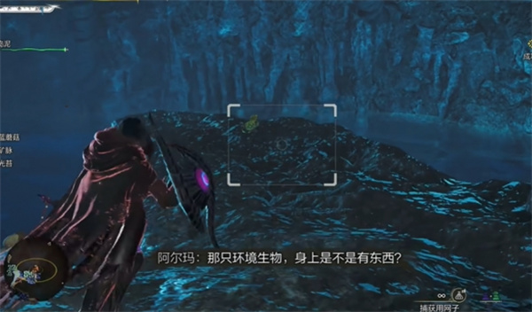 随后捕捉前面的环境生物“古盏蟹”,以及前面水下的鱼。