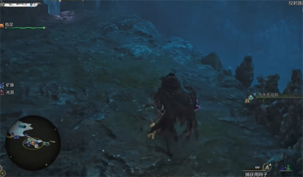 抓完后往回走,在上面没有被遮挡的崖壁位置往下跳。