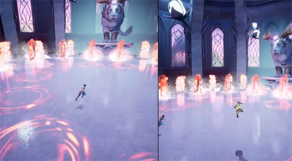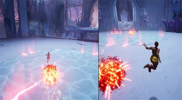 接下来的招式是冰龙卷,冰龙卷完了之后带刺火球和爆炸冰花会一起放,可以通过绕着中间水池跑来躲避。