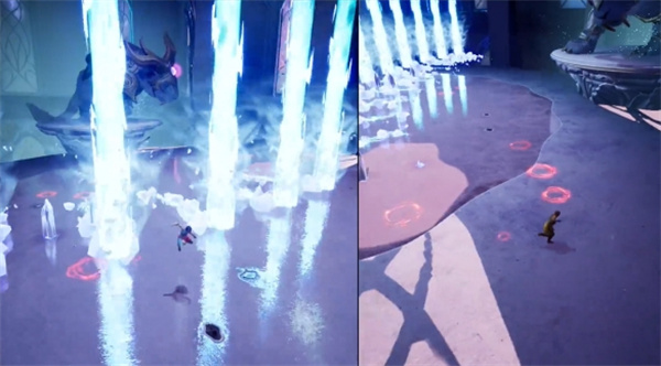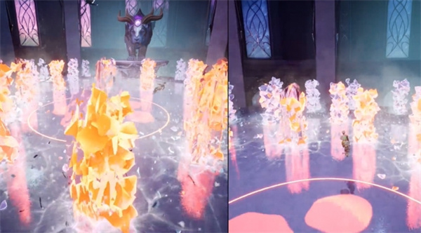 这招是全场AOE,但中间的大冰晶降落时间会迟于周围的小冰晶,我们可以先到中间躲一会,最后再到间隙中躲最后的大冰晶。