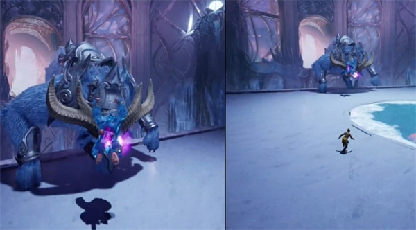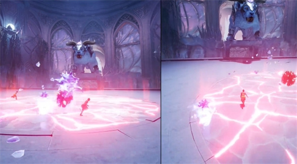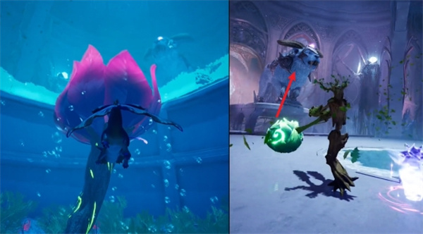 BOSS起身但站立不动时变成树人缠住它的手,把它的头拉到地上;另一位角色变成猿胖揍BOSS的大脸巴子。