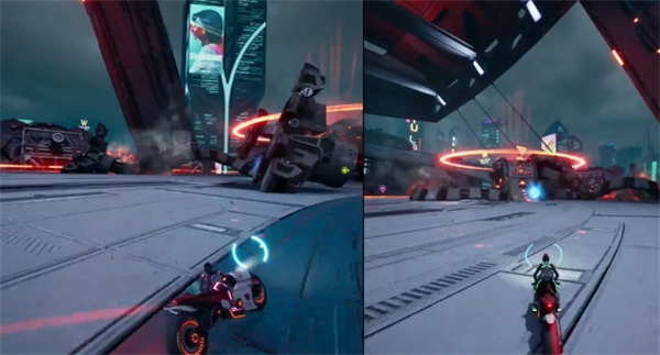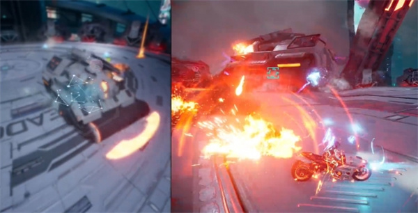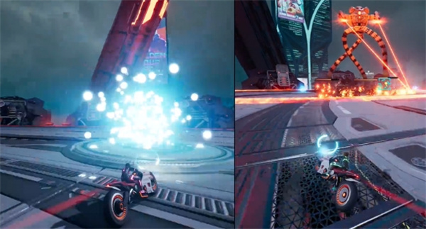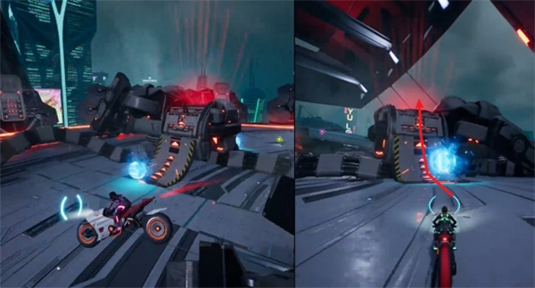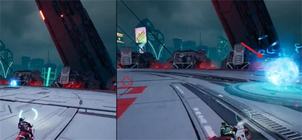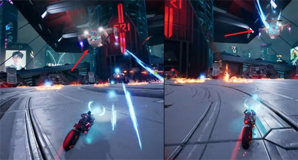 场地上蓝色的光球是摩托车弹药来源,车前能量条会提示我们目前剩余的弹药量。