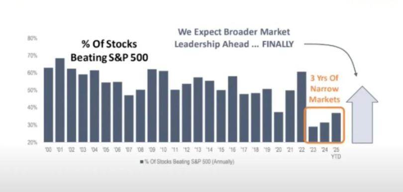关于经济重新加速向好的观点其实很片面,目前主要依靠富裕家庭的资产和人工智能带动的投资在支撑。对投资者来说,这个周期不能简单指望市场普涨: