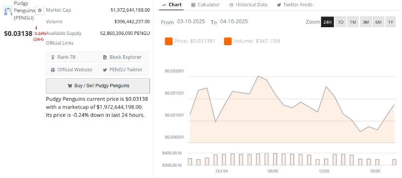 胖企鹅币现报0.03138美元,24小时跌幅0.24%。数据来源:Brave New Coin