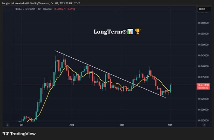 PENGU在多头回踩后守住0.031美元基底,目标上看0.036及0.043美元。数据来源:LongTerm/X