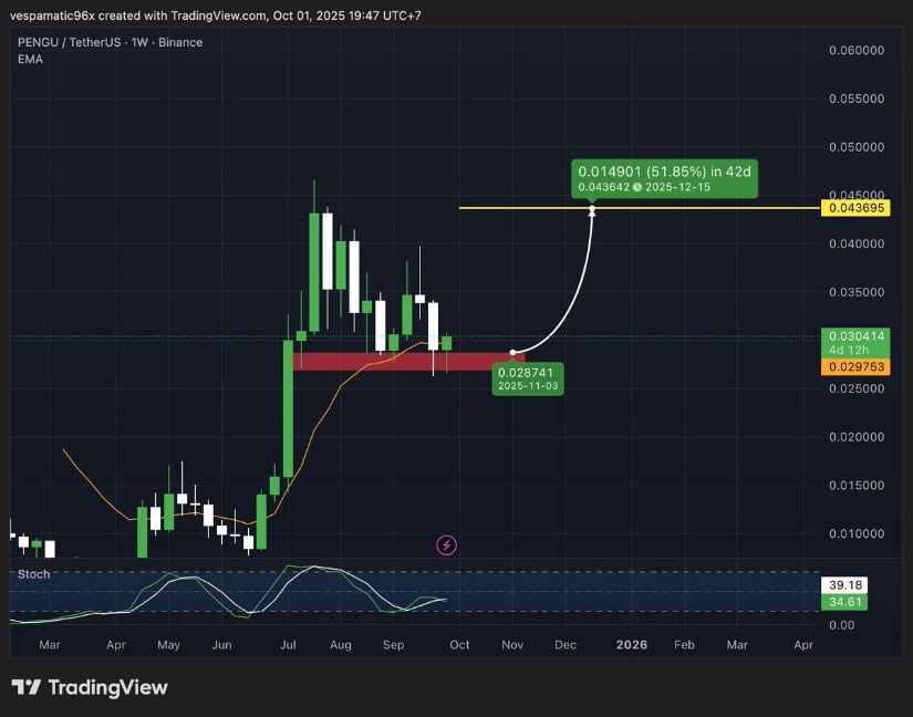 当前形态预示着,若后续能突破0.0380美元阻力位,将打开冲击0.06-0.07美元目标区的空间。周线图表显示,只要当前基底得到维护,该预测目标将有效成立。从宏观层面看,PENGU在这一结构中的韧性巩固了其作为2025年头部MEME币的地位。