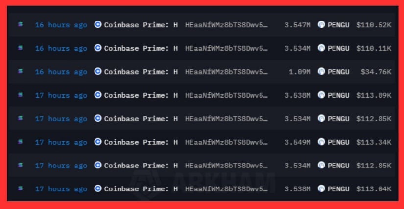 Coinbase Prime资金外流显示鲸鱼吸筹,PENGU卖压减轻且上行潜力增强。数据来源:Dan The Guy/X