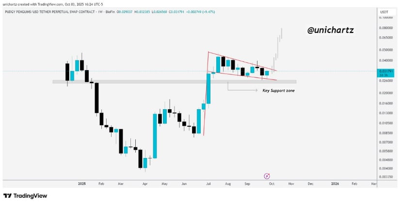 PENGU大周期构筑看涨旗形,突破后目标看向0.06-0.07美元区间。数据来源:UniChartrz/X