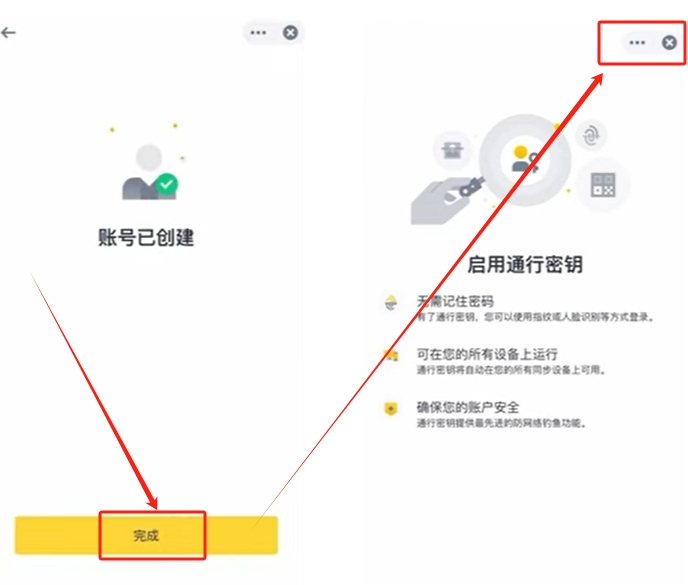 就显示账号已经创建成功了。非常的简单。我们只需要邮箱认证一下就好了。点击完成之后,就会跳出让你开启通行秘钥。这个通行秘钥优点类似于调用手机的指纹和面部识别这样的功能。开了用的时候会方便一点,不开其实也没什么区别。我这里先点右上角的叉号关掉。系统就会自动跳出来让你实名认证。